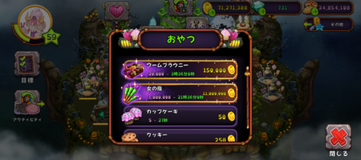 今回の限定おやつは、「ワームブラウニー」と「女の指」です。ものすごい見た目とネーミングですね。ワームブラウニーは15万コインで2万個のおやつを作れるので、常時焼けるおやつと比べると5万コインお得です。指の方は、1千100万コインで100万個のおやつなので、常時焼けるおやつに比べたら100万コイン分お高いのですが、この数のおやつが1日で焼き上がるというのはずいぶん早いです。サラダは2日かかりますからね。どんどん焼くとコインが足りなくなりそうですが、どんどん食べさせてモンスターにたくさんコインを稼いでもらいましょう🪙