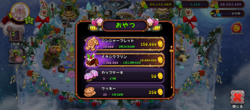 今回のメニューは、「ジンジャーブレッド」(価格15万コイン、おやつ数2万個、獲得経験値10万)と、「イチジクプリン」(価格1千万コイン、おやつ数130万個、獲得経験値700万)でした!どちらもコスパ・タイパ共にとっても優れているので、どんどん焼いちゃいましょう🎂