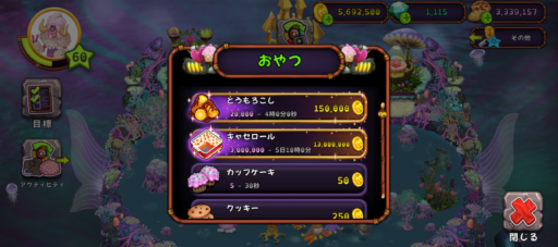 今回の限定おやつは、「とうもろこし」(価格15万コイン、おやつ数2万個、焼成時間4時間)と「キャセロール」(価格1300万コイン、おやつ数300万個、焼成時間5日と10時間)です。とうもろこしは、できあがるおやつ数に対して5万コインお得です。キャセロールはできあがるおやつ数に対して、なんと1700万コインお得。更にサラダを3回焼くのに比べたら14時間お得です。が、同時に3台で焼くのに比べたら、注文から焼き上がりまでの時間はずいぶん長いです。ちなみにキャセロールがどんな食べ物かというと、でっかいグラタン皿みたいな鍋に食材を入れてオーブンで焼いた、グラタンとかラザニアみたいな雰囲気のものだそうです。ケーキかと思ったら違いました。
