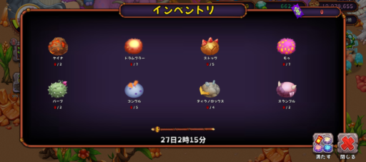続いて、植物の島でティラノロックス、風の島でコングル、地の島でドラムプラー、炎の楽園でバーブ、炎のオアシスでウィンク、光の島でボスクス、超能力の島でプロペット、妖精の島でストッグ、骨の島でスランブルをブリーディングします。その続きは、下記のような感じで進んでいくのではないか⋯と想像します。各島のブリーディング器の数や、プレイする頻度によっても進み方は変わってくるので、あくまでも私が想像したものとして目安程度に見てくださいませ。参考になったら嬉しいです。